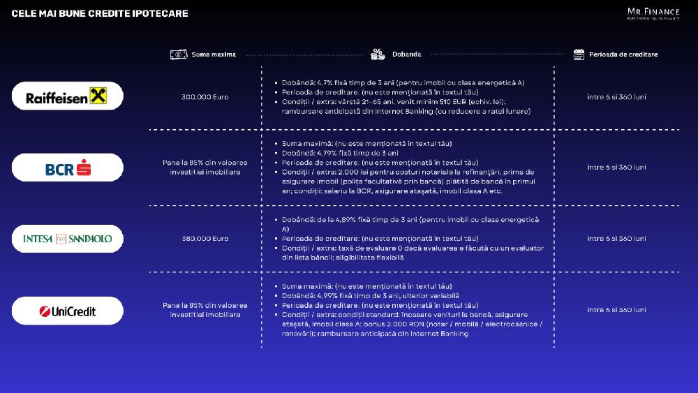Raiffeisen propune una dintre cele mai mici dobânzi din piață: 4,7% fixă în primii trei ani pentru imobile cu clasă energetică A. Banca permite rambursări anticipate direct din aplicația de internet banking, iar condițiile minime de venit sunt accesibile.