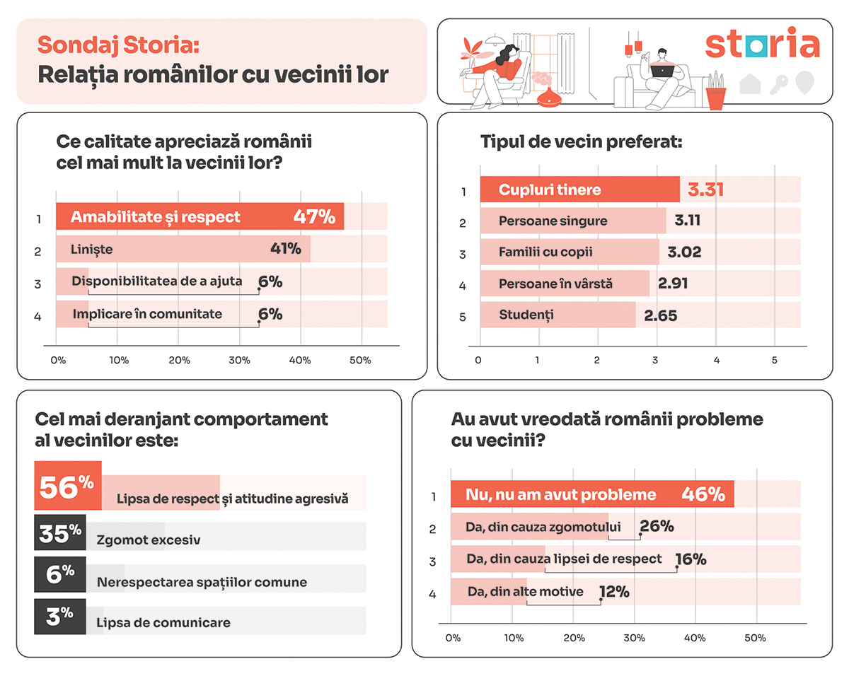 Un sondaj realizat de Storia – platforma imobiliarã lansatã de OLX, a analizat percepțiile românilor asupra vecinilor și factorii care influențeazã relațiile de conviețuire. Rezultatele aratã cã amabilitatea și respectul sunt cele mai apreciate calitãți (47%) ale vecinilor, urmate de un criteriu esențial: liniștea (41%). În schimb, doar 6% respondenți considerã importante implicarea în comunitate sau disponibilitatea de a ajuta, ceea ce sugereazã o abordare individualistã.