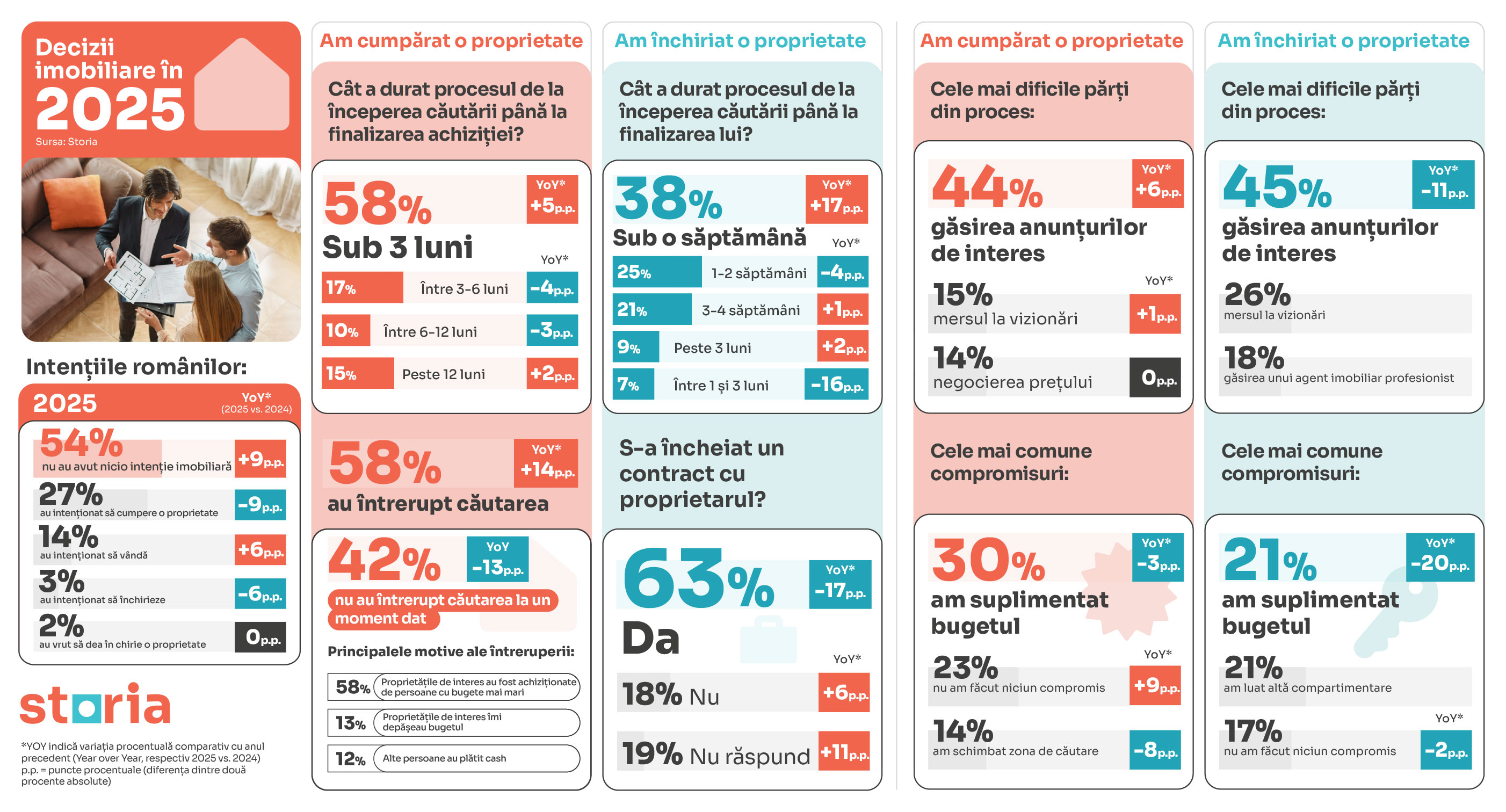 În cazul respondenților care au achiziționat o proprietate în 2025, procesul de la începerea căutării până la finalizarea achiziției a fost mai rapid decât în anii anteriori. 58% au finalizat achiziția în mai puțin de trei luni, o creștere de 5 puncte procentuale față de anul trecut. Totuși, pentru 17% durata a fost între 3 și 6 luni, pentru 15% a depășit 12 luni, iar pentru 10% dintre respondenți procesul a durat între 6 și 12 luni.